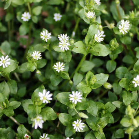 Chickweed forms low, mat-like growth through winter, with small paired leaves and soft white flowers. It creeps into weak patches and can take hold quickly if lawns aren’t maintained.