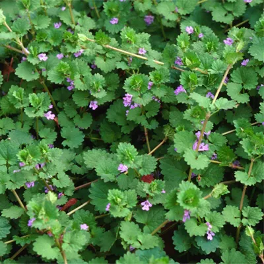Creeping Charlie produces kidney-shaped leaves and violet-blue flowers. It travels across the ground, rooting at each node.