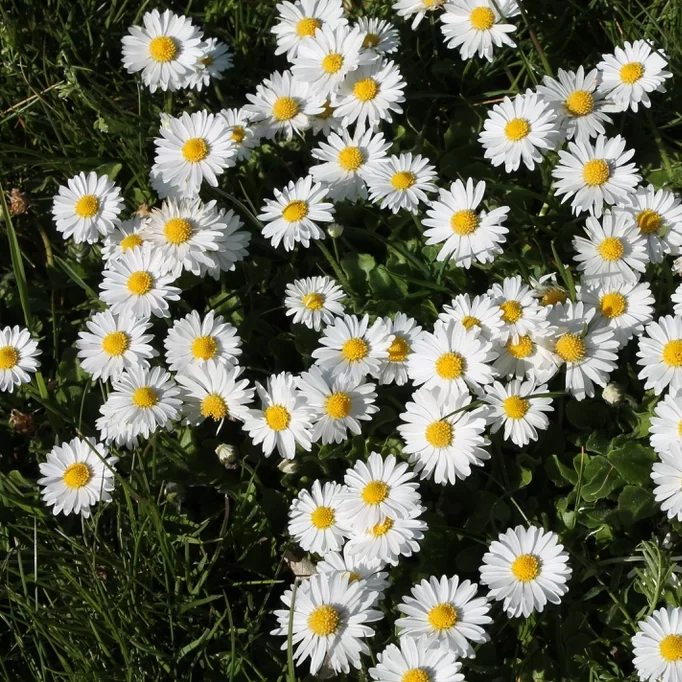 Daisies form tight rosettes of leaves and bright white flowers with yellow centres. They can cluster quickly in thinner lawns.