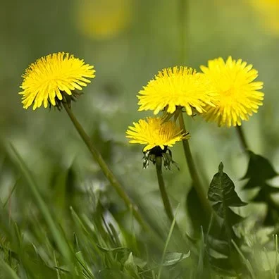 Dandelions form yellow flowers on hollow stems and have long taproots. They appear anywhere turf is thin or stressed.