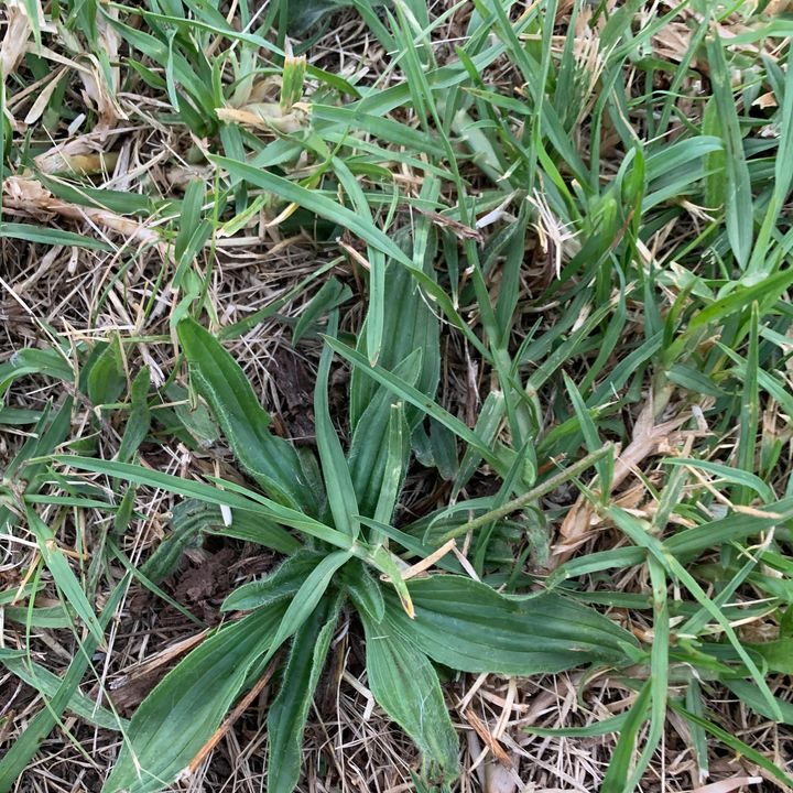 Plantain forms long vertical seed stems and broad leaves with distinct veins arranged in a rosette.