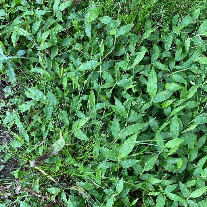 Paspalum has broad leaves with a slight purple tinge near the base and is common in warm months. If left to seed, it spreads quickly.